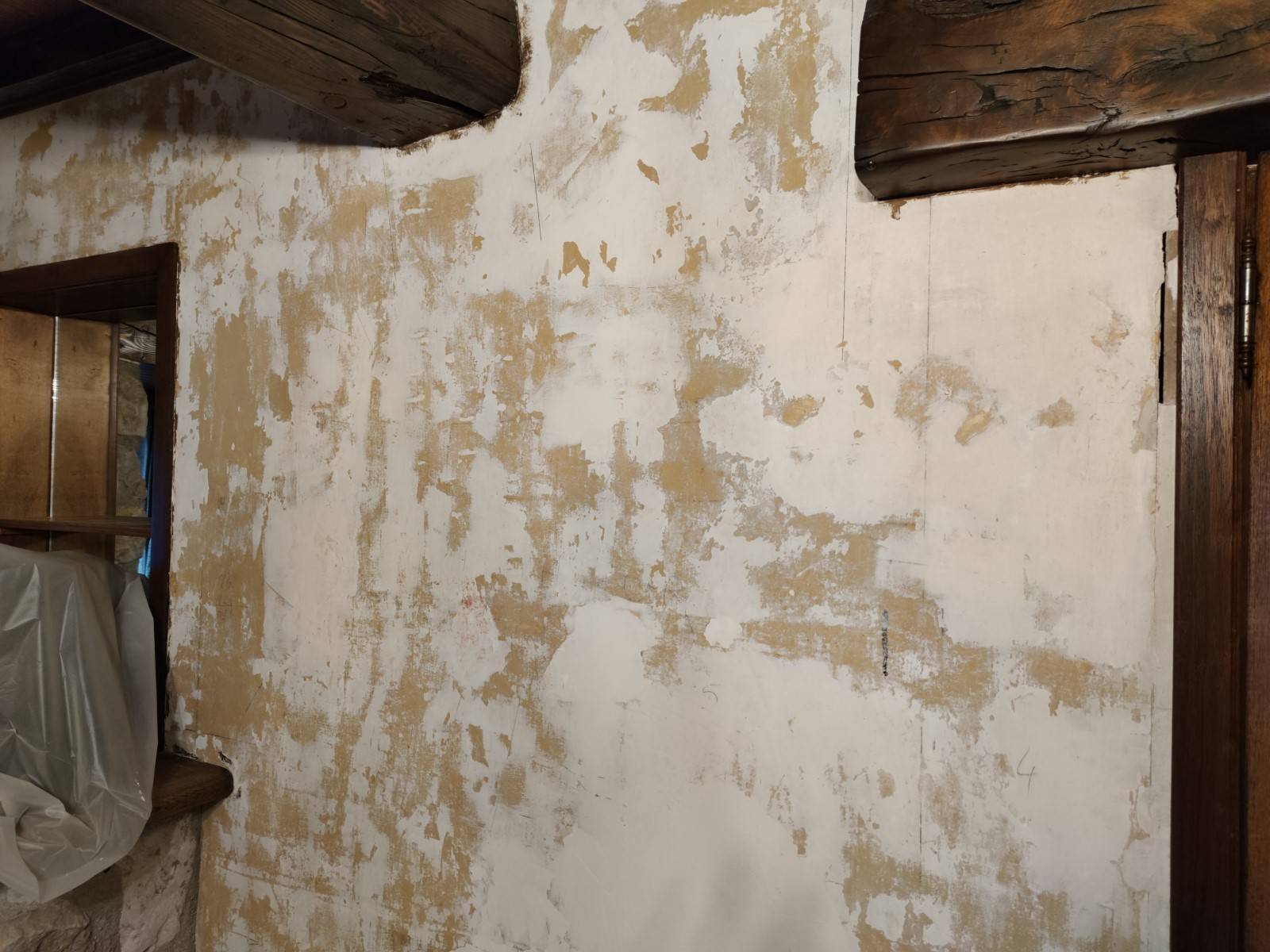 Un traitement est nécessaire avant d’enduire. Nous avons gratté les parties non-adhérentes et aspirer les murs. Une couche d’impression glycéro a été passé afin de bien fixer le fond. Douze heures après nous avons procédé au rebouchage des aspérités avec un enduit de rebouchage. Ensuite, une à deux passes d’enduits fin est nécessaire pour obtenir une surface lisse.